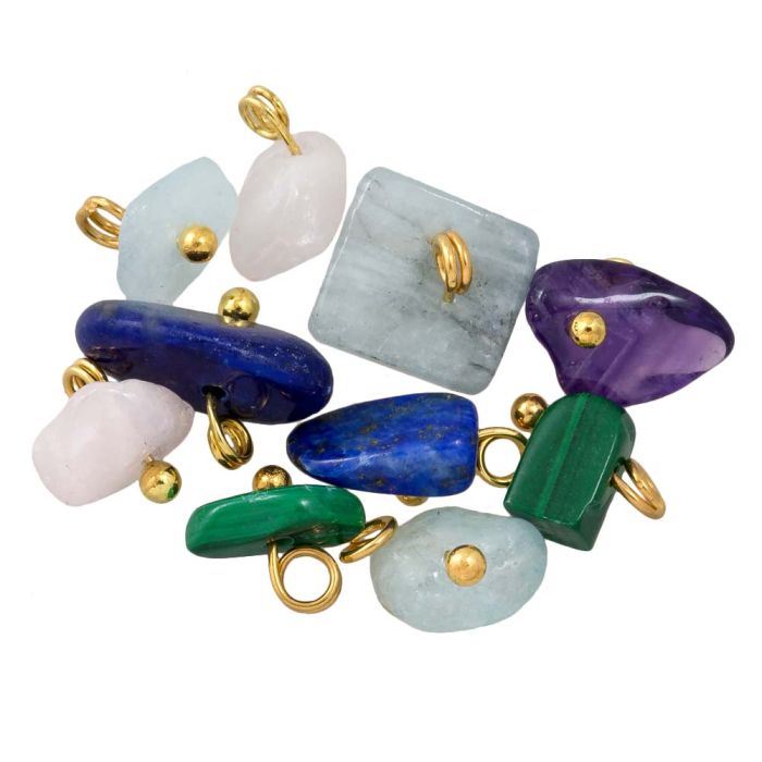 Deze bedelmix is een willekeurige mix en kan natuurlijk malachiet, amethist, rozenkwarts, lapis lazuli en aquamarijn bevatten. De bedels hebben een goudkleurig oogje.