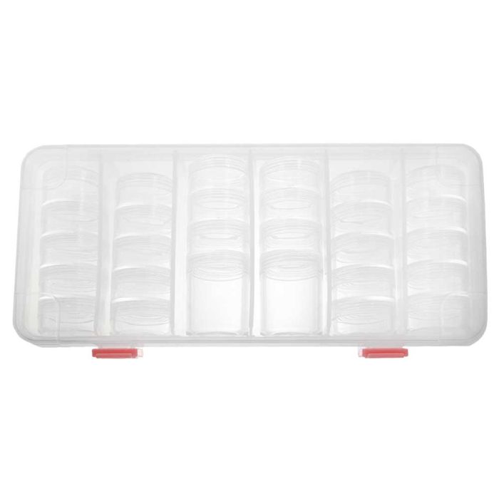Handige opbergbox van kunststof met 28 bakjes. De afmetingen van de doos zijn ca. 26.5 x 13 x 4.5 cm, van de grote bakjes (5.2 x 10.5 cm), van de kleine bakjes (3.9 x 3 cm).