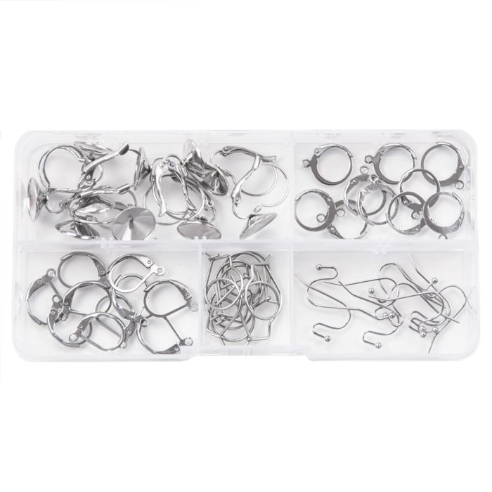 Voordeelpakket met 5 verschillende soorten oorbellen. De oorbellen met de ronde tray zijn geschikt i.c.m. onze Rivoli puntstenen van 12 mm. Het plastic bakje kun je uiteraard weer opnieuw gebruiken door je kralen of andere sieraad onderdelen in te bewaren.