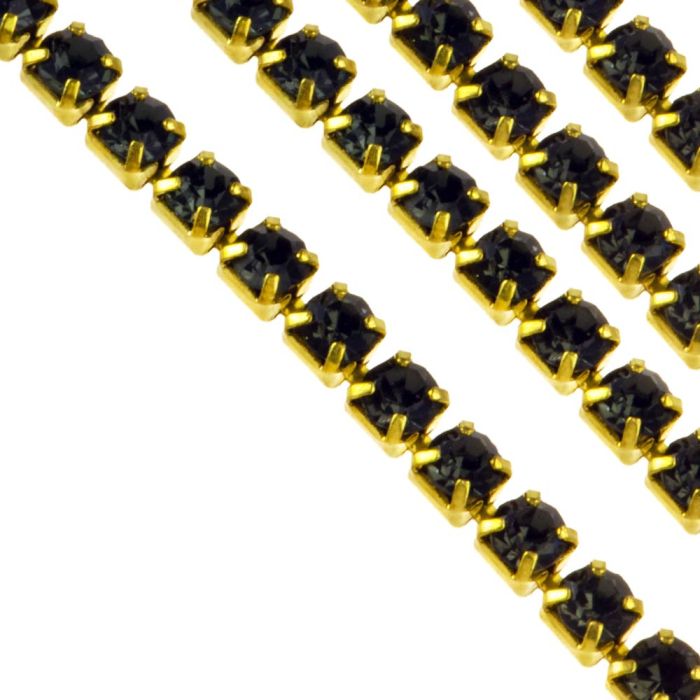 Rhinestone Ketting (2 mm) Goud - Black Diamond (2 Meter)