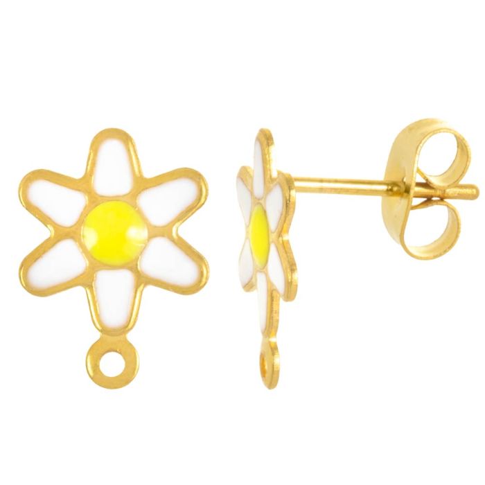 Stainless Steel Oorstekers Enamel Bloem met Sluiting (12.5 x 9 mm) White-Goud (2 Stuks)