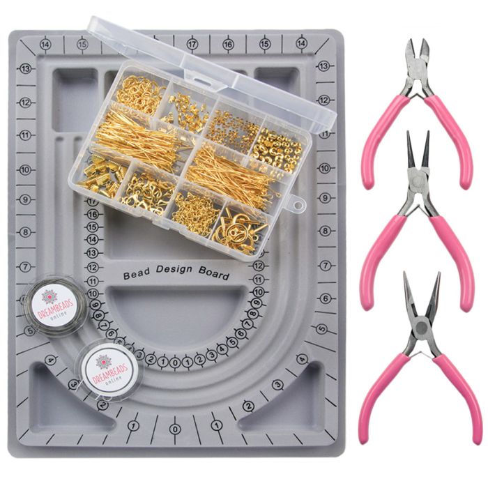 Startpakket Goud voor sieraden maken. Met een startpakket kun je zelf eenvoudig mooie sieraden samenstellen. Dit XL startpakket bevat belangrijke benodigdheden zoals een tangenset, kralenbord en goudkleurige onderdelen. Een startpakket is ideaal voor als je net begint met sieraden maken. De onderdelen zijn van allergievrij metaal met een uitstekende prijs-kwaliteit verhouding.